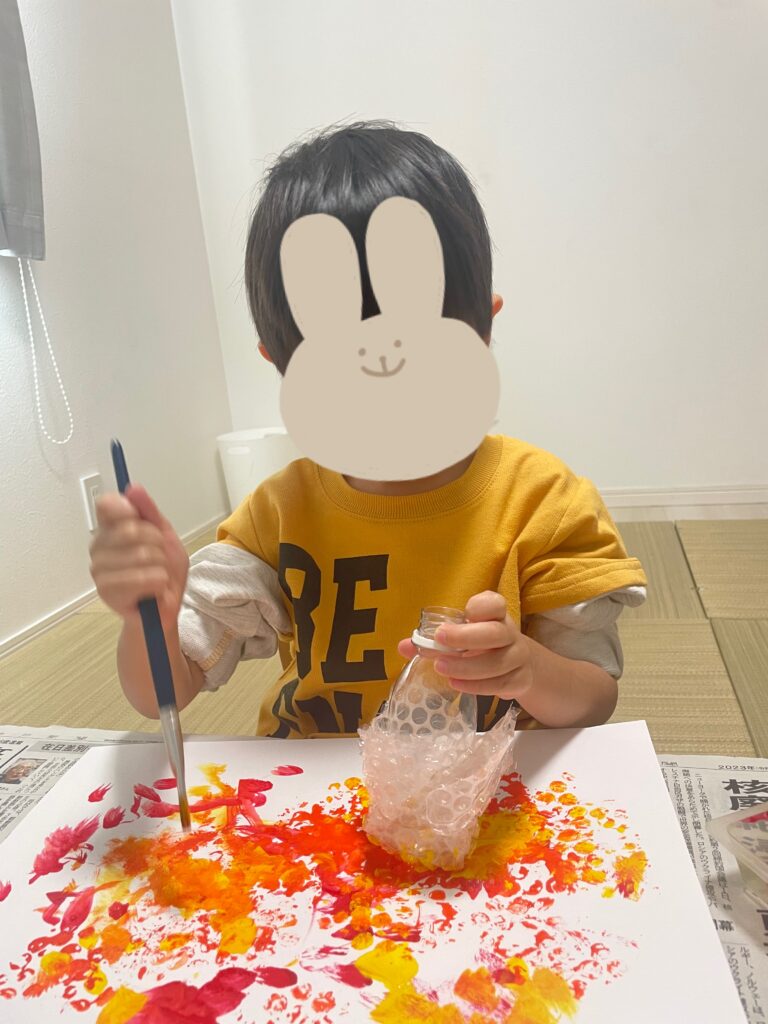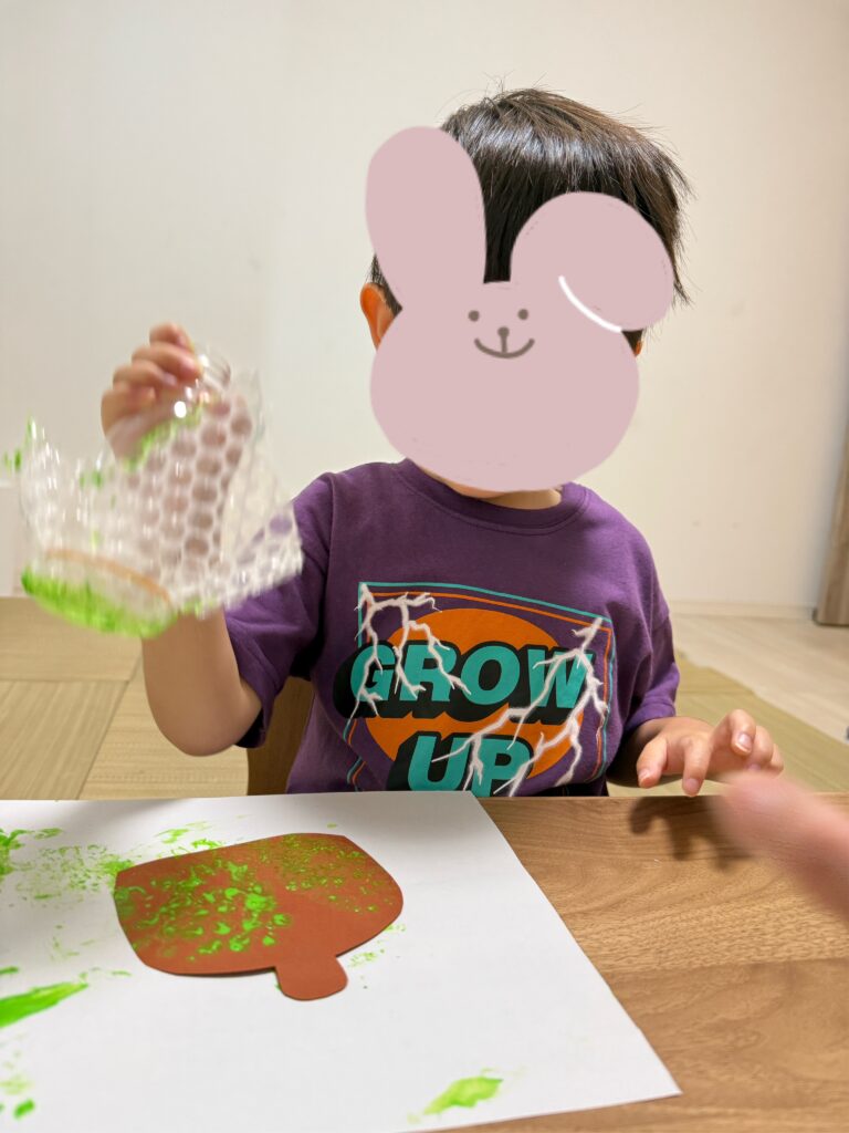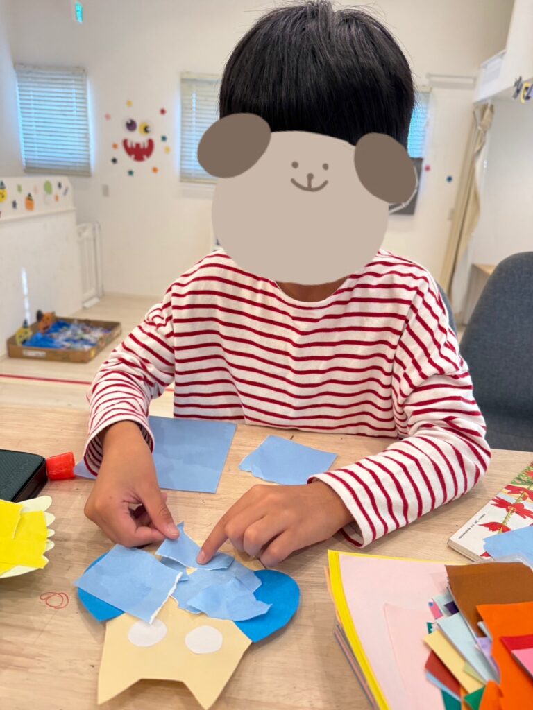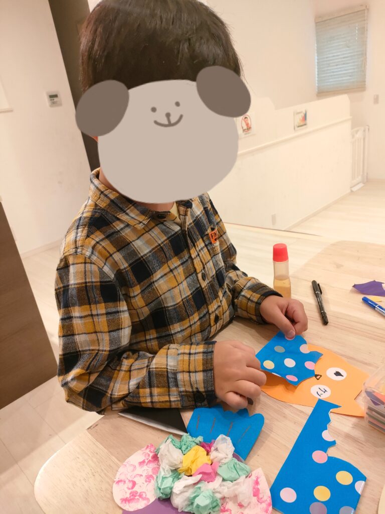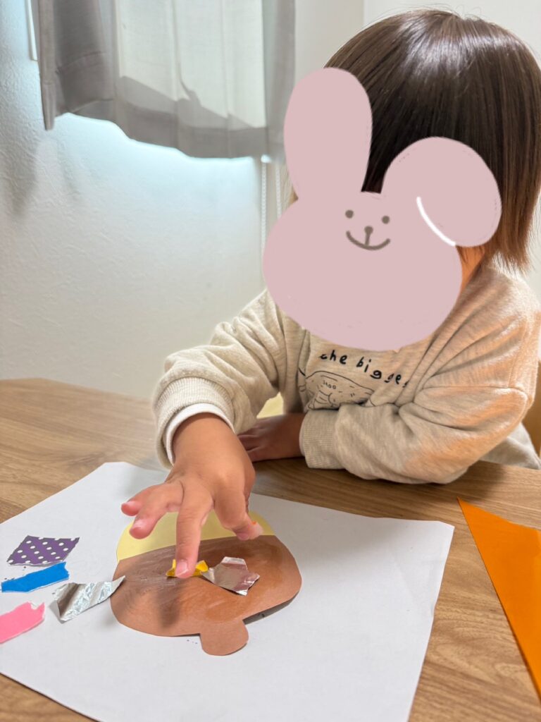 どちらも子どもたちが好きなように模様や顔を描いて楽しめる内容で、お花紙をくしゃっと丸めたり、折り紙を細かくちぎって貼ったり、絵の具でぽんぽんとスタンプをしたりと、手先をたくさん使いながら楽しんでいましたよ🤩