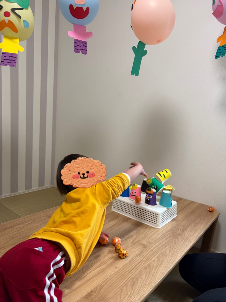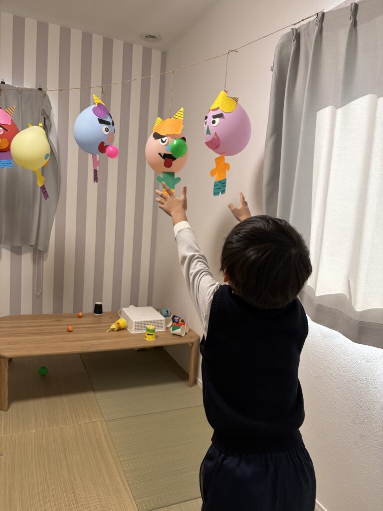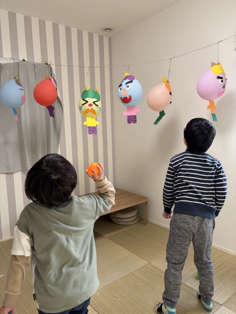 紙コップ鬼や風船鬼をめがけて「鬼はそと~福はうち~」とボールをポーン!!!