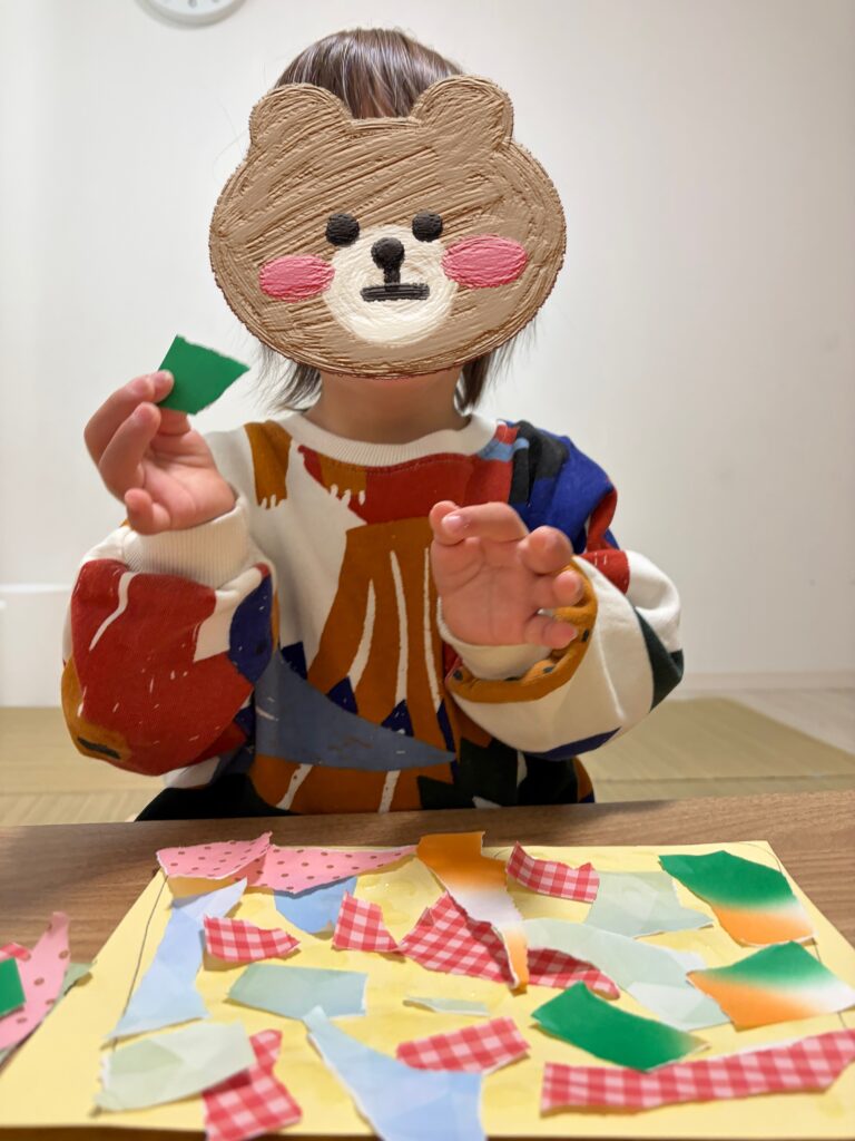 折り紙をビリビリ破いて貼ったり、好きな絵を描いたりして、カラフルで個性たっぷりなパンツの出来上がりです💕